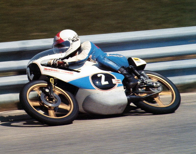 Quinze saisons au guidon des bicylindres 2-temps dont trois couronnées d’un titre mondial sur Morbidelli et MBA en 1976, 1977 et 1980, plus un titre de vice-champion en 1985, font de lui un interlocuteur plus que sérieux dans le domaine de la compétition de vitesse, et, cerise sur le gâteau, l’homme n’a pas sa langue dans sa poche.