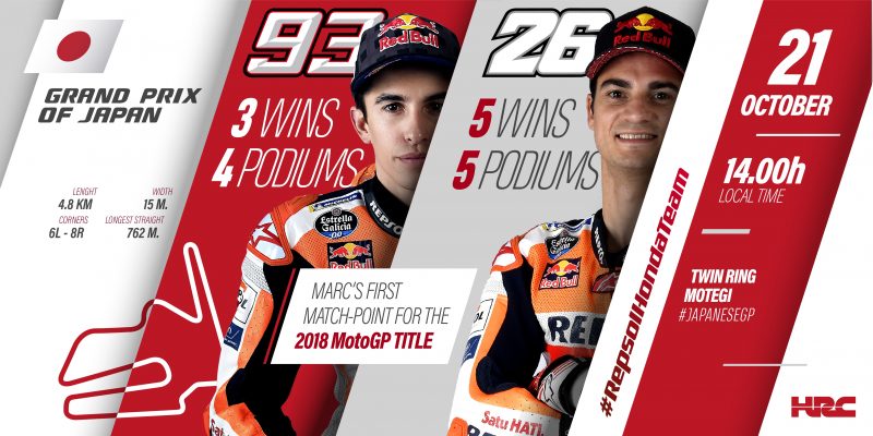 Après sa victoire en Thaïlande, Marc Márquez se rend au Grand Prix du Japon, la 16e manche de la saison, avec 77 points d’avance sur Andrea Dovizioso et 99 sur Valentino Rossi, et donc le souhait inévitable d’y concrétiser sa première possibilité d’obtenir son 5e titre en catégorie reine devant ses employeurs nippons, comme il l’a déjà fait à 2 reprises en 2014 et 2016.