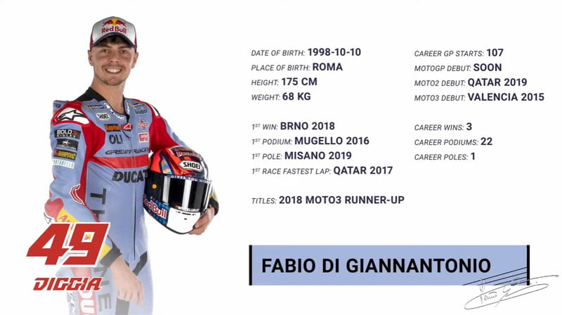 « Oui, car j’ai toujours utilisé le 21 mais cette année je ne peux pas car Morbidelli l’a, donc j’ai dû faire un grand changement. J’ai choisi le 49 après une petite recherche : je pense que le 49 n’a jamais été utilisé en MotoGP, donc j’essaierai de marquer l’histoire, non seulement en utilisant ce numéro mais en essayant de le mettre tout en haut. Ce sera donc un changement énorme pour moi, pour moi avec le passage en MotoGP : un très grand challenge ! »