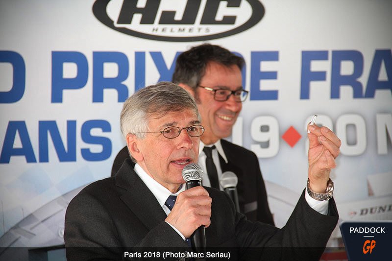 S’en est suivi un message vidéo de Jacques Bolle, Président de la FFM : «  bonjour à tous ! 25 ans ! Ça fait 25 ans que Claude Michy organise le Grand Prix de France de vitesse. Je me souviens de son arrivée, c’était en 1994, il n’était pas très connu à l’époque mais il avait été le seul à relever un défi qui semblait compliqué. En 1992, deux ans avant, Bernie Ecclestone avait repris le contrôle des Grands Prix. En France, un promoteur avait bien tenté, à Magny-Cours, d’organiser le Grand Prix mais ce fut un échec. Il n’y eut donc pas d’édition en 1993 mais en 94, Claude se lança dans l’aventure. D’abord au Mans, puis quelques années au Paul Ricard, puis retour, depuis l’an 2000, au Mans. Pour la fédération, ce fut une collaboration fructueuse, et notamment depuis 10 ans, où nous avons initié, Claude et moi, un partenariat qui va au-delà du Grand Prix à travers le soutien des pilotes français. Alors Claude, je ne sais pas si toi et moi nous serons encore là dans 1/4 de siècle pour fêter le 50e anniversaire, mais en tout état de cause, je te souhaite, nous souhaite, une excellente 25e édition de l’ère Michy, avec du beau temps, des Umbrella Girls, et une victoire française ! »