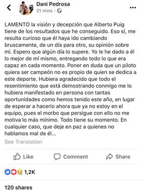 Paroles en l’air ? Non, cette fois Pedrosa montré les crocs et répond sur les réseaux sociaux : « je regrette la vision des choses d’Alberto Puig comme sa déception au sujet des résultats obtenus avec moi. Oui, j’ai trouvé curieux son brutal changement de comportement à mon égard. D’un jour à l’autre, il a changé d’avis sur moi. J’espère qu’un jour on pourra tirer un trait sur tout ça. Je lui ai donné le meilleur de moi-même, je lui ai livré tout ce dont j’ai été capable à chaque instant ».
