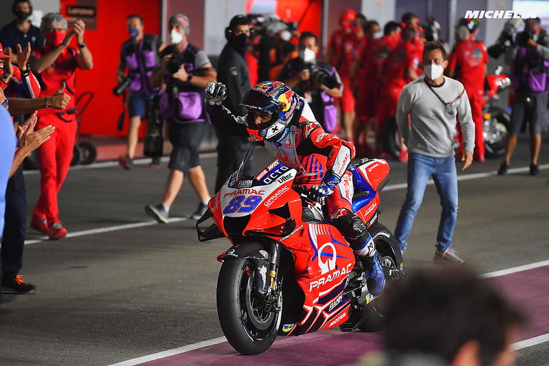 Six jours plus tard, le pilote Pramac démontre qu’en plus d’apprivoiser la GP 21 en ligne droite, il sait aussi le faire en virage, en s’adjugeant pour 15 centièmes la pole position du Grand Prix de Doha devant son expérimenté coéquipier français.