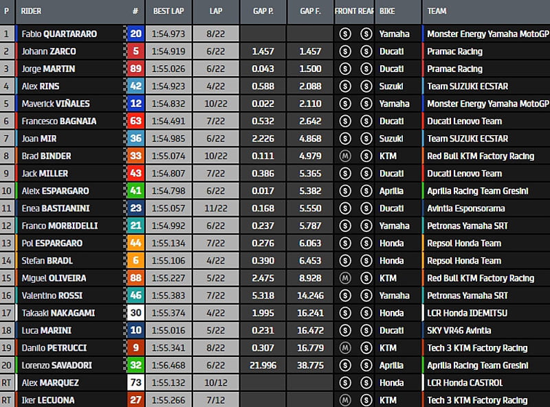Le pilote de 30 ans a ajouté : « ce fut un Grand Prix vraiment difficile pour moi. Nous avons déjà remarqué lors des essais libres que les pneus sont trop sollicités. En course, j’ai vraiment eu du mal avec la moto. J’ai quand même accéléré, mais dans la ligne droite du départ, j’ai perdu tout ce que j’avais gagné dans les courbes ».