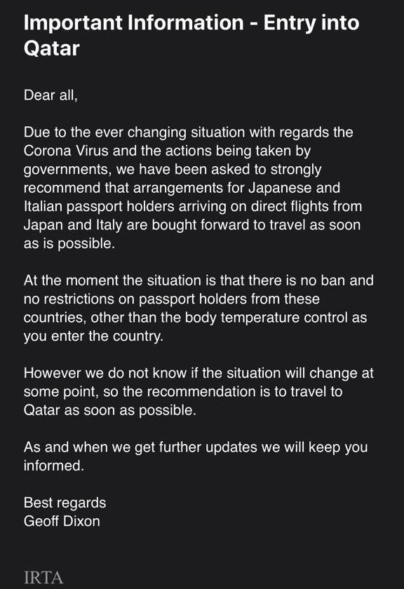 Une menace sérieuse puisque l’IRTA avertit les équipes et les participants japonais et italiens au Grand Prix de Losail de partir pour le Qatar dès que possible afin d’éviter d’éventuelles modifications des modalités d’accès au pays.