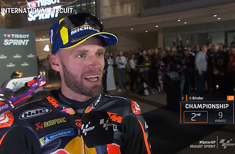 A peine descendu de sa KTM RC16 officielle après avoir terminé 2e du Sprint du Grand Prix du Qatar sur le circuit de Lusail, Brad Binder s’est confié devant les caméras du site officiel MotoGP.com avec la joie d’avoir réussi sa rentrée des classes et la satisfaction des progrès faits sur sa machine…