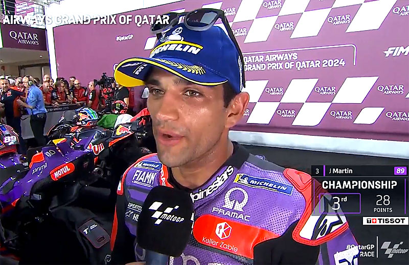 A peine descendu de sa Ducati GP24 du team Pramac après avoir terminé 3e du Grand Prix du Qatar sur le circuit de Lusail, Jorge Martin s’est confié devant les caméras du site officiel MotoGP.com avec la satisfaction d’avoir fait un week-end sans faute…