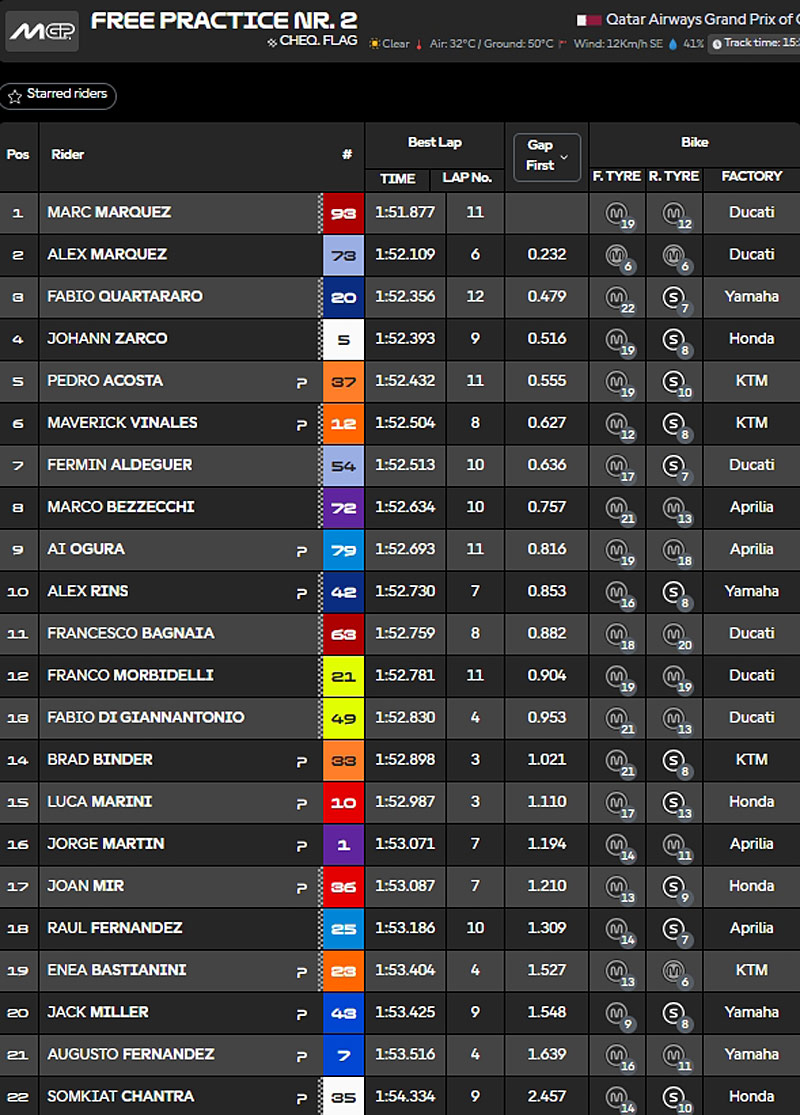 Résultats de la FP2 du Grand Prix du Qatar MotoGP 2025, à Lusail :
