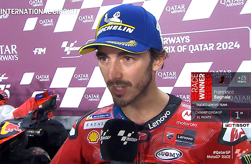 A peine descendu de sa Ducati GP24 officielle après avoir remporté le Grand Prix du Qatar sur le circuit de Lusail, Francesco Bagnaia s’est confié devant les caméras du site officiel MotoGP.com avec la satisfaction d’avoir, une fois de plus, redresser magistralement la barre entre le vendredi et le dimanche…