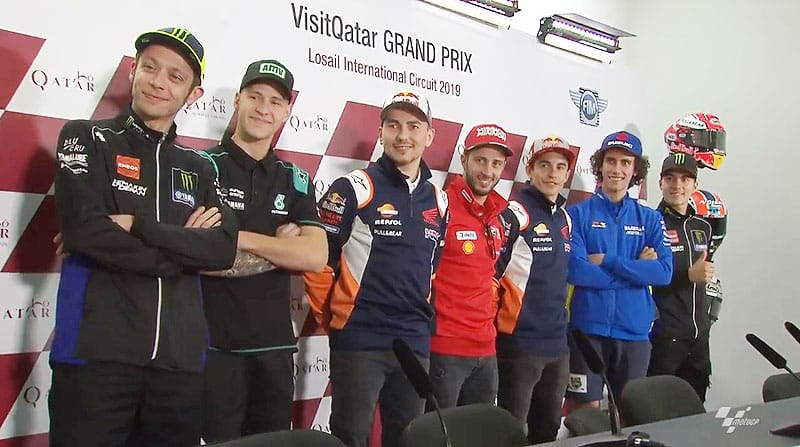 Cette conférence de presse en prélude au Grand Prix du Qatar a réuni Marc Márquez, Andrea Dovizioso, Valentino Rossi, Maverick Viñales, Álex Rins, Jorge Lorenzo et Fabio Quartararo.