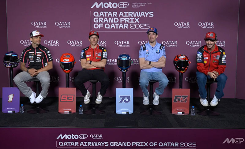 La conférence de presse du jeudi, en prélude au Grand Prix du Qatar MotoGP, a accueilli de façon classique les trois premiers du championnat pour répondre aux questions de la presse internationale, Alex Marquez, Marc Marquez, Francesco Bagnaia, mais aussi celui dont on salue le grand retour, Jorge Martin.