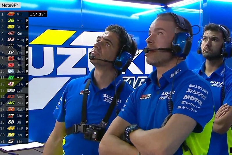 Lors de la deuxième séance, Joan Mir réalisait le meilleur temps à 13 minutes de la fin en 1’54.433, avec alors 0.3 d’avance sur Marc Marquez. Il avait réalisé son tour rapide seul, sans suivre un autre pilote. Jack Miller le battait deux minutes plus tard en 1’54.394, mais on avait vécu deux très belles minutes dans le stand Suzuki.