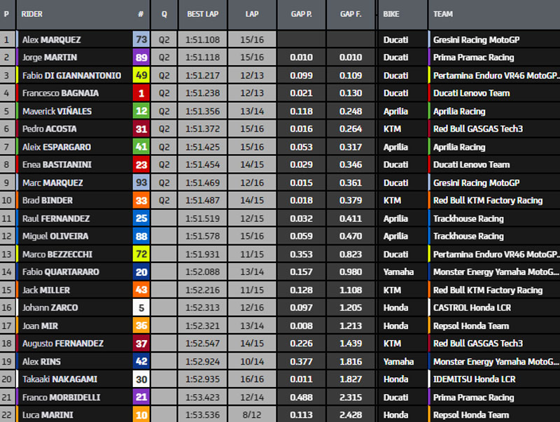 Avant le dernier run, on a donc Jorge Martin, Marc Márquez, Enea Bastianini, Raul Fernandez, Francesco Bagnaia, Binder, Marco Bezzecchi, Maverick Vinales, Miguel Oliveira, Alex Márquez, Aleix Espargaro, Fabio Di Giannantonio, Jack Miller, Pedro Acosta, Johann Zarco, Joan Mir, Fabio Quartararo, Alex Rins, Augusto Fernandez, Takaaki Nakagami, Luca Marini Franco Morbidelli.