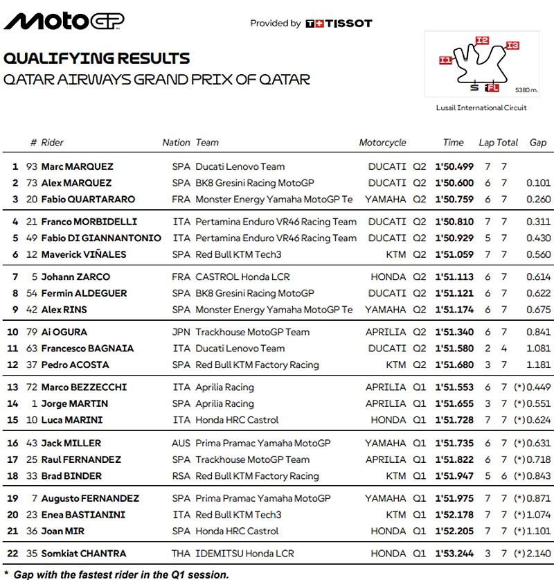 Résultats des qualifications du Grand Prix du Qatar MotoGP 2025 :