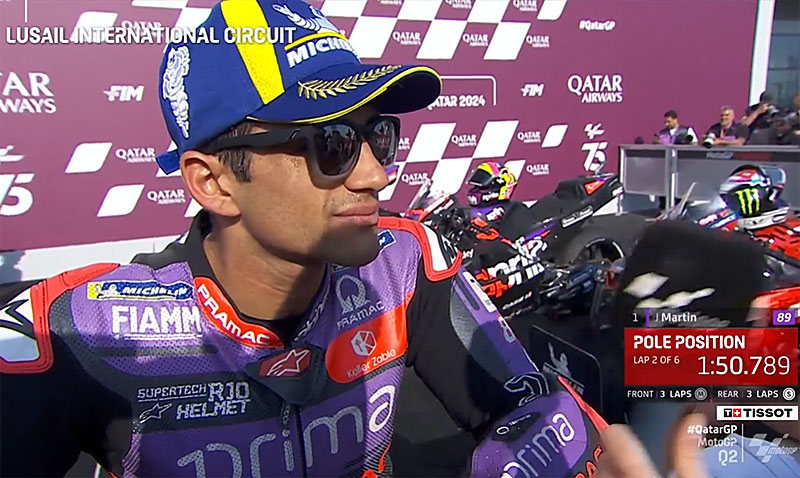 A peine descendu de sa Ducati GP24 du team Pramac après avoir dominé les qualifications du Grand Prix du Qatar sur le circuit de Lusail, Jorge Martin s’est confié devant les caméras du site officiel MotoGP.com avec la satisfaction d’avoir bien fait son travail, mais que le plus dur reste à faire…