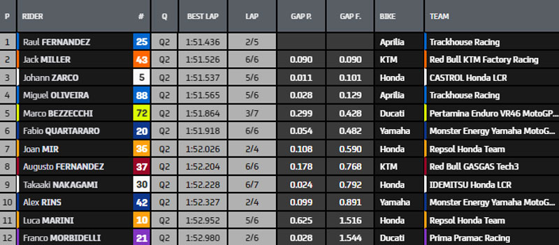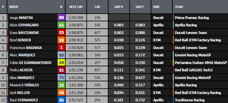 Top5 provisoire : Martin, A.Espargaro, Bastianini, Binder et Bagnaia.
