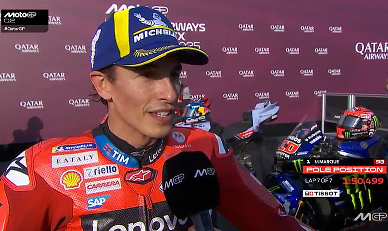 A peine descendu de sa Ducati GP25 du team d’usine Ducati Lenovo après avoir remporté la qualification du Grand Prix du Qatar MotoGP 2025 sur le circuit de Lusail à Doha, Marc Marquez s’est confié devant les caméras du site officiel MotoGP.com avec la satisfaction d’obtenir une pole position inattendue…