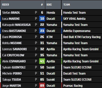 La liste des pilotes MotoGP admis à cette première séance d’essais de l’année, le shakedown (déverminage) comporte 13 noms.