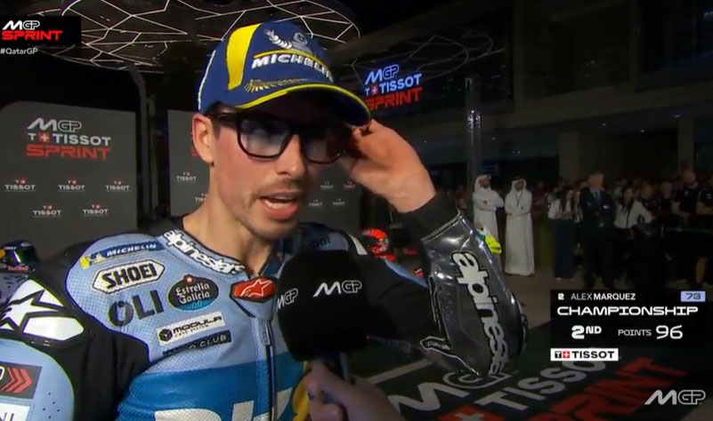 A peine descendu de sa Ducati GP24 du team satellite Gresini Racing après avoir terminé 2e du Sprint du Grand Prix du Qatar MotoGP 2025 sur le circuit de Lusail à Doha, Alex Marquez s’est confié devant les caméras du site officiel MotoGP.com avec la joie d’être toujours 2e …