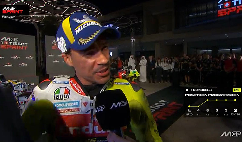 A peine descendu de sa Ducati GP24 de l’équipe satellite Pertamina Enduro VR46 Racing Team après avoir terminé 3e du Sprint du Grand Prix du Qatar MotoGP 2025 sur le circuit de Lusail à Doha, Franco Morbidelli s’est confié devant les caméras du site officiel MotoGP.com avec sans doute l’envie de rejoindre au plus vite Valentino Rossi son équipe pour fêter cela…