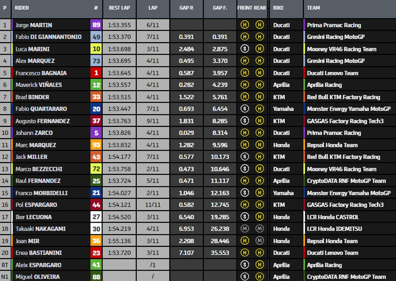 Martin est en tête devant Di Giannantonio, Marini, AMarquez, Bagnaia, Vinales, Binder, Zarco, MMarquez et Quartararo.