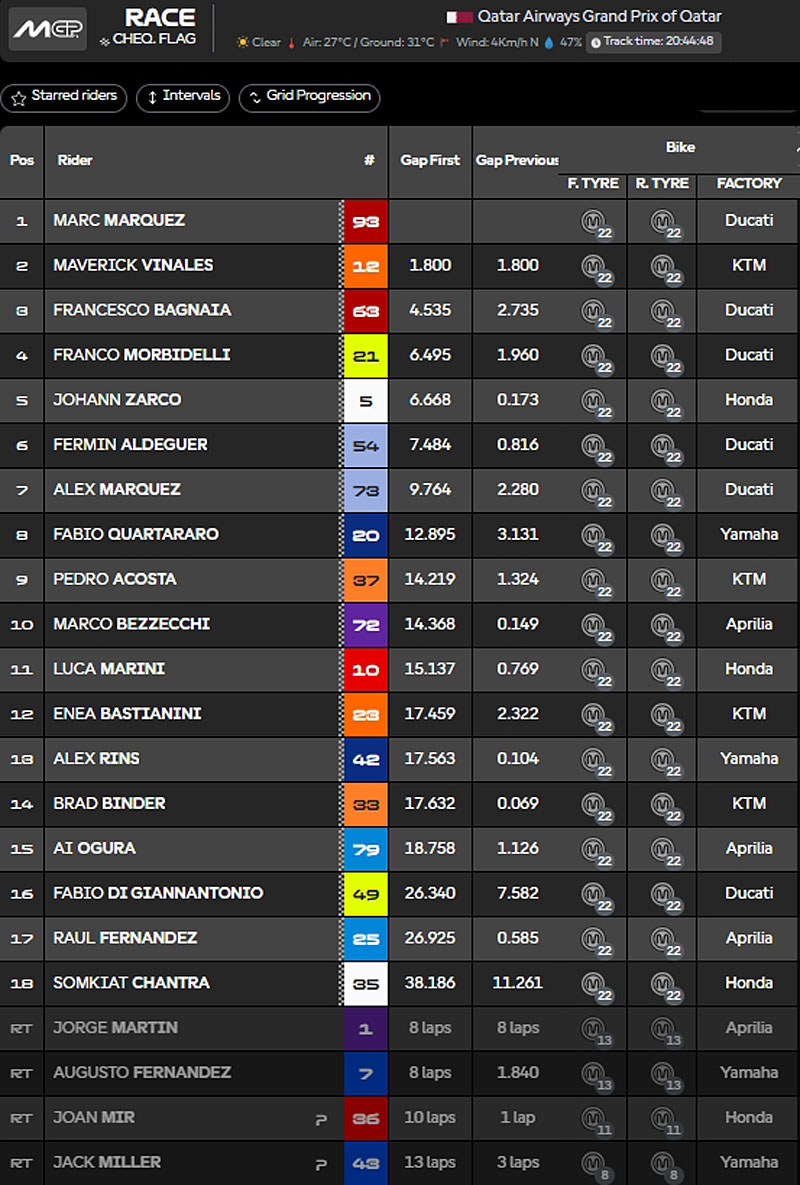 Résultats du Grand Prix du Qatar MotoGP 2025 :