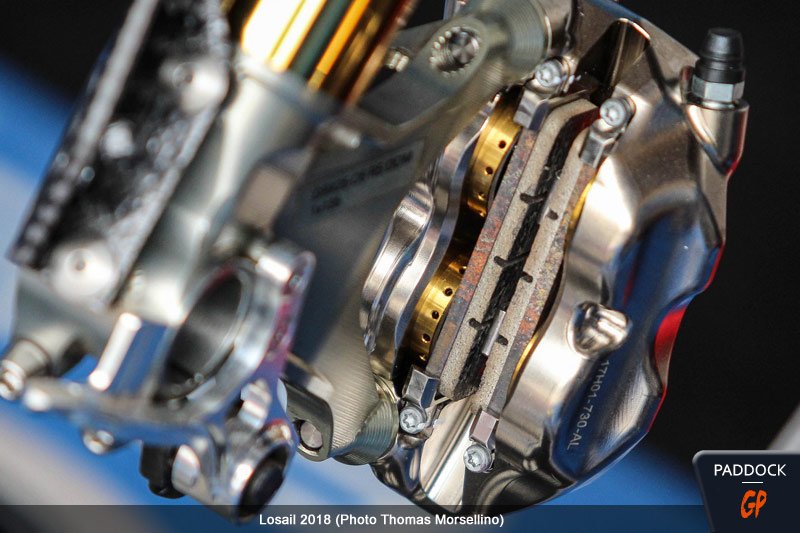 Juste pour info, car nous ne savons absolument pas si cela a un rapport avec l’incident survenu au Qatar, les plaquettes du système de freinage Brembo MotoGP sont bloquées dans leur logement par des languettes tenues par des petites vis située sous l’étrier. Si une de celles-ci se casse ou se desserre, le risque de perdre une plaquette n’est plus du tout nul.