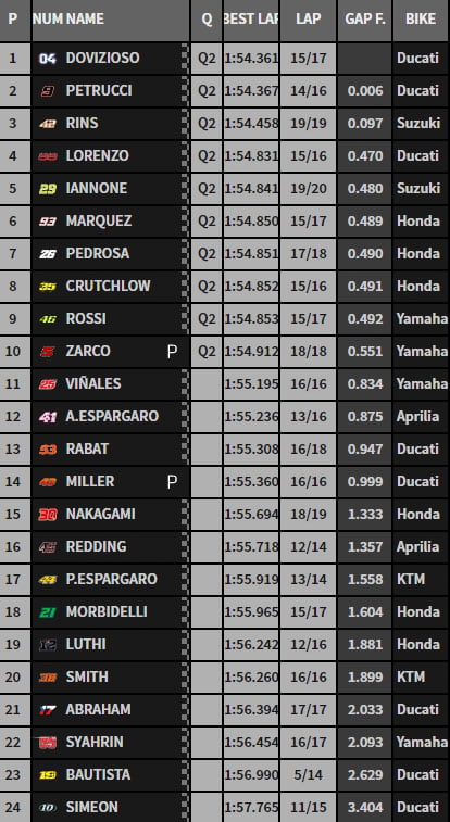 À la fin du premier run, le top 10 est constitué de Marc Márquez, Cal Crutchlow, Andrea Dovizioso, Alex Rins, Danilo Petrucci, Valentino Rossi, Aleix Espargaro, Dani Pedrosa, Maverick Vinales et Jack Miller.