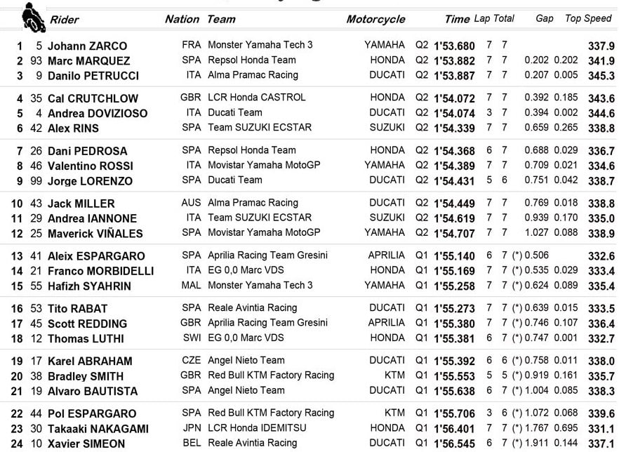 Ce premier Grand Prix de l’année est favorable à Danilo Petrucci qui va s’élancer dimanche depuis la première ligne de la grille de départ, après avoir réalisé le troisième temps des qualifications derrière Johann Zarco et Marc Marquez. Il devance les deux Ducati officielles d’Andrea Dovizioso et Jorge Lorenzo.