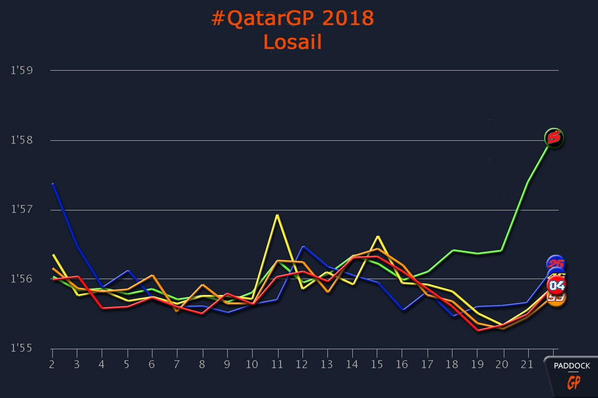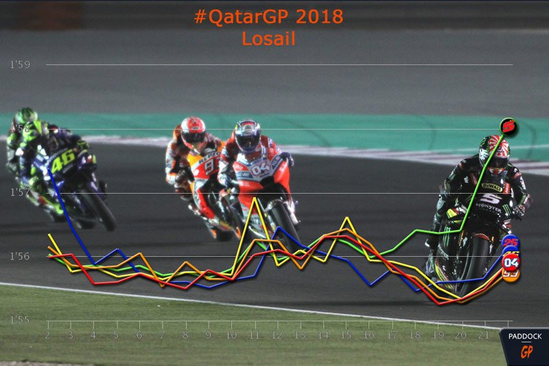 – À partir du 17e tour, Johann Zarco commence à décrocher alors que Andrea Dovizioso, Marc Márquez et Valentino Rossi accélèrent le rythme, démontrant ainsi qu’ils en avaient encore sous la poignée. Ils passent le pilote français au 18e tour et même Maverick Vinales ne suit plus tout à fait la cadence.