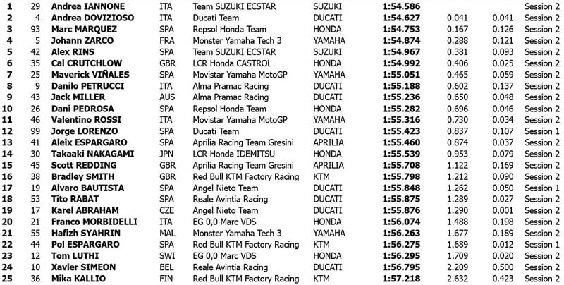 En 1’55.188, il se positionnait à 0.602 du meilleur temps d’Andrea Iannone. Par rapport aux deux autres Desmosedici modèles 2018, il était à six dixièmes d’Andrea Dovizioso deuxième, mais quatre dixièmes devant Jorge Lorenzo quatorzième.