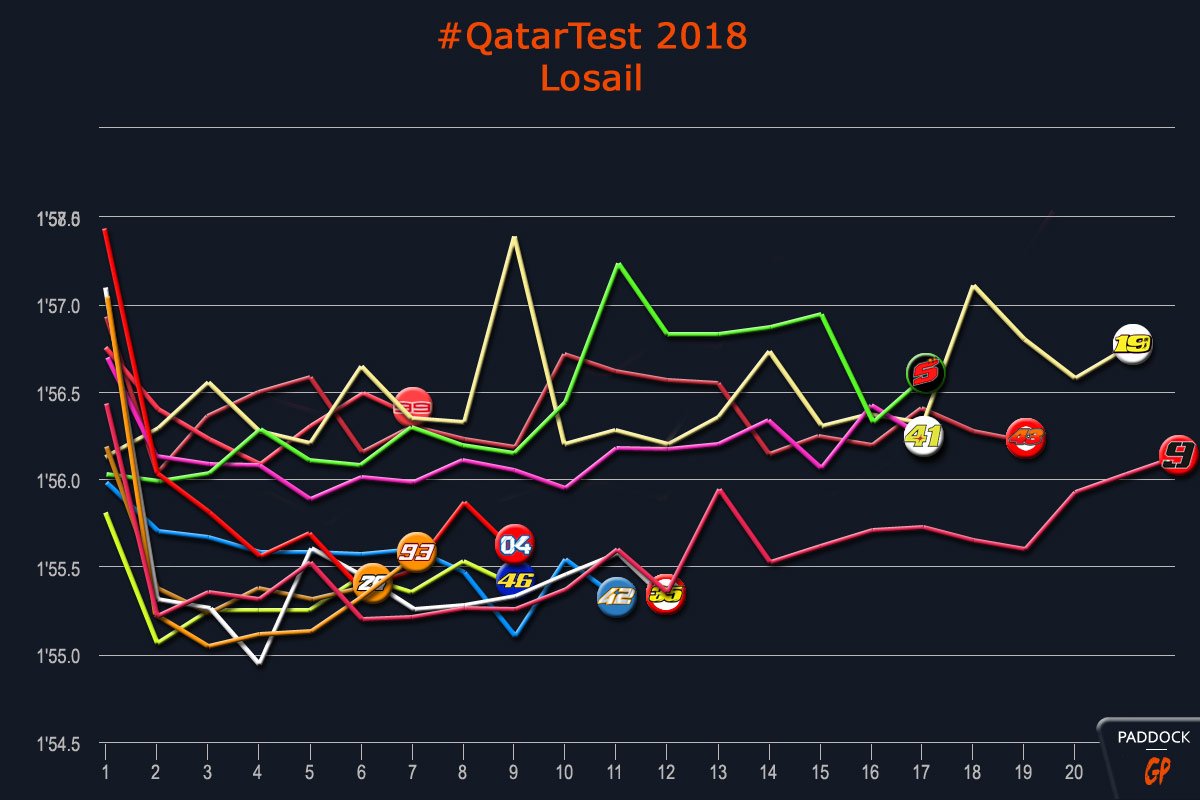 D’emblée, on s’aperçoit de la présence de deux groupes, le premier comprenant Marc Márquez, Cal Crutchlow, Valentino Rossi, Dani Pedrosa et Danilo Petrucci, roulant entre 1’55 et 1’55.5 en simulation de course, le second comprenant Aleix Espargaro, Jack Miller, Álvaro Bautista, Jorge Lorenzo et Johann Zarco, roulant entre 1’56 et 1’56.5.