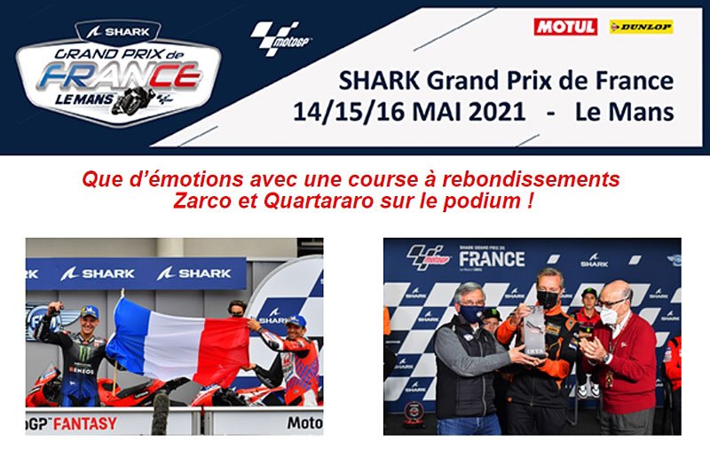 « Quelle course et surtout quel bonheur de voir Johann Zarco et Fabio Quartararo sur le podium de ce SHARK Grand Prix de France 2021 ! La météo capricieuse nous aura permis d’assister à une course à suspense, marquée notamment par une magnifique remontée de Johann qui termine à une marche de cette première victoire tant attendue, derrière l’australien Jack Miller et devant son compatriote Fabio Quartararo. Nos deux français repartent du Mans en position de leader du Championnat du Monde pour Fabio et en 3ème position pour Johann. De très bon augure pour la suite de la saison qui sera à suivre avec attention.