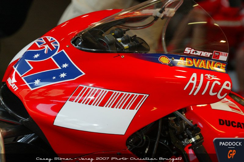 En 2007, Casey Stoner rejoint Capirossi sur la GP7. Le passage aux 800cc a été bien anticipé par Filippo Preziosi et le pilote australien s’avère tout de suite imbattable. Avec 10 victoires en 18 courses, complétées par un succès de Capirossi au Japon, Stoner apporte le titre mondial à Ducati, devant Honda (2 victoires) et Yamaha (4 victoires). On le sait, ce titre reste le seul jusqu’à aujourd’hui.