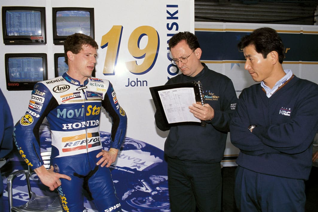 « Pour moi, c’est définitivement le deux temps, parce que pour un mécanicien, c’est un monde différent. Vous aviez beaucoup plus de variables ; personne n’utilisait un moteur qui n’avait pas été modifié. Tout le monde faisait ses changements ; parfois vous aviez gagné de la puissance et parfois vous en perdiez, mais vous aviez toujours travaillé dessus. De nos jours, personne ne touche aux moteurs, entre autres parce que c’est interdit. Les motos à quatre temps ont beaucoup de travail de réglage, électronique ou mécanique, mais il y a peu de travail manuel. Il y a peu de choses que vous pouvez faire avec vos mains. Quand on travaillait sur les deux-temps, même si c’était une moto d’usine, tout le monde faisait ses petits trucs. Chaque jour, il fallait enlever les selles et regarder les pistons, etc. ».