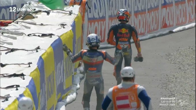 A propos d’accrochage et de chute, Pol Espargaró raconte sa mésaventure avec Miguel Oliveira, lui aussi sur une KTM… « Dans ce virage, je suis allé large, et Miguel un peu aussi. Nous avons tous les deux allumé le gaz et ne nous sommes pas vus, alors nous avons touché le sol. J’ai de bonnes relations avec Miguel et je sais que c’est un bon pilote, nous avons déjà parlé ensemble et il est devenu clair que c’était un accident de course ».