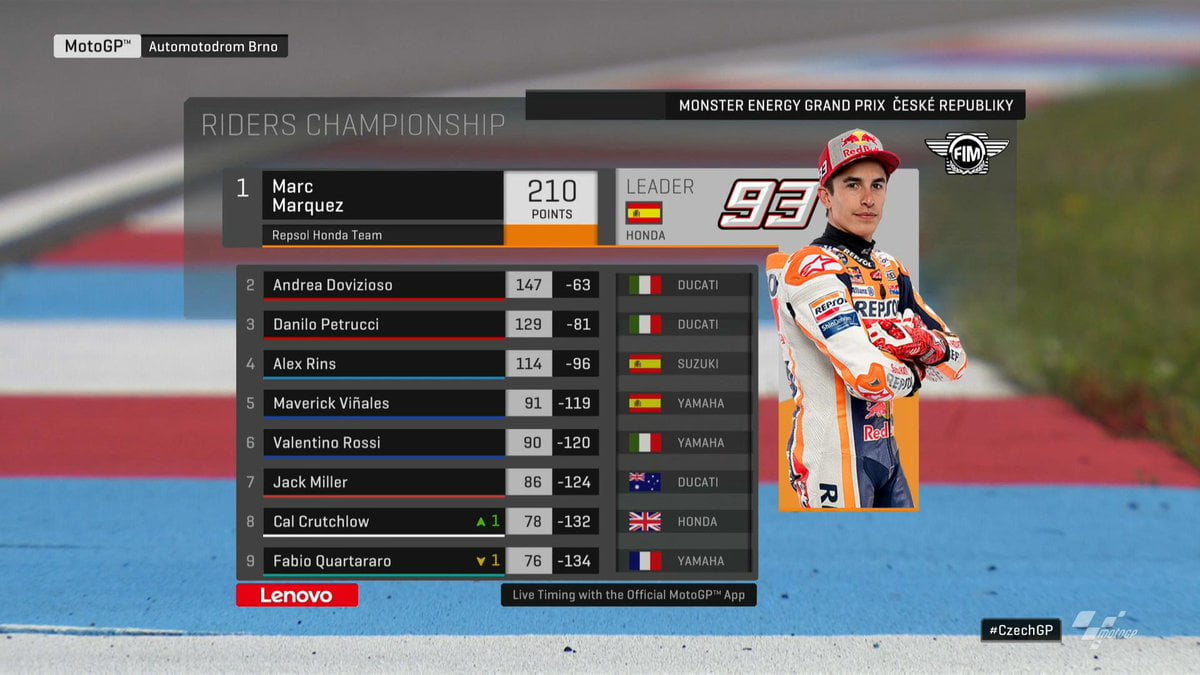 Viñales reste cinquième bien qu’il soit passé au travers du rendez-vous tchèque. Il ne compte qu’un seul point d’avance sur Valentino Rossi qui a fini sixième à Brno. Jack Miller, quant à lui, peut jubiler. Il conforte sa place de meilleur pilote indépendant. Il devance Crutchlow de 8 points et Fabio Quartararo de 10. Ce dernier reste meilleur rookie et de loin puisque Mir a été la victime collatérale de la chute de Morbidelli en début de course. Pol Espargaró est toujours dans le top 10 du championnat avec 61 points marqués. Nakagami lorgne sa position car il n’a que trois points de retard sur l’officiel KTM.