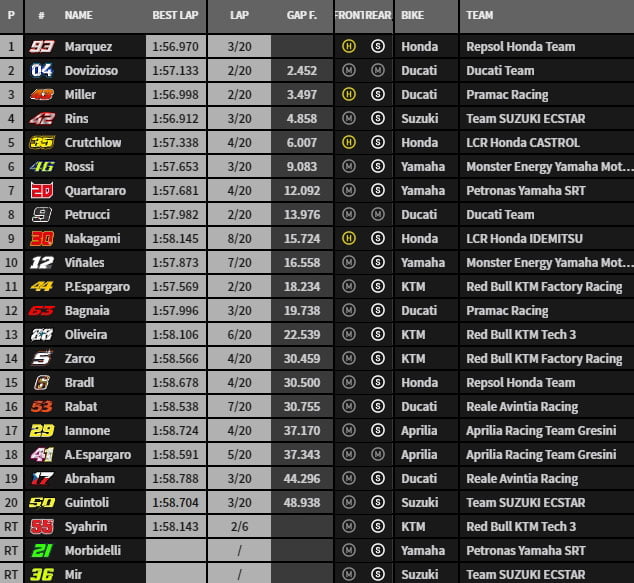 « Ce fut un week-end difficile car nous n’avons pas fait grand-chose sur le sec » a déclaré Quartararo de l’équipe Yamaha Petronas. « Choisir le bon pneu était très compliqué. J’ai pris un bon départ, car j’avais les slicks sur la partie sèche de la piste. La ligne idéale dans le premier virage était très étroite, j’ai donc piloté prudemment. Puis j’ai dû tout donner pour doubler, je ne pouvais pas ménager les pneus. En fin de compte, je suis satisfait de la septième place. C’était notre objectif. Je suis le meilleur rookie ».