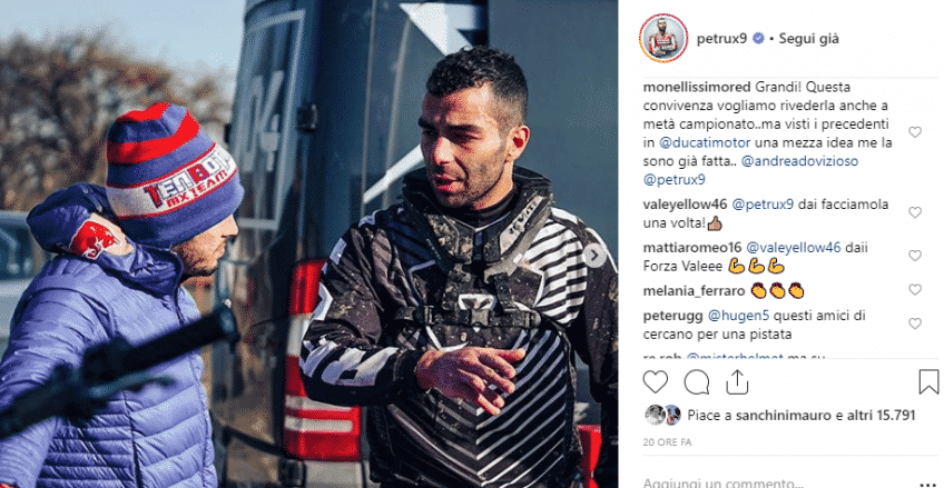Les deux coéquipiers se sont donc retrouvés près de Porto Recanati, sur la piste « Da Cassetta » pour un entraînement de motocross, comme indiqué dans une publication Instagram sur leurs comptes respectifs. La surprise est venue de Valentino Rossi qui a commenté sur le compte de Petrucci : « Qui est le plus rapide en motocross ? Toi ou Dovizioso ? » Son compatriote n’a alors pas tardé à lui répondre : « C’est une belle bagarre, nous devrions organiser un super défi tous ensemble. » Le Docteur a alors accepté la proposition : « Allez, faisons ça. » Qui sait si on ne pourrait pas bientôt les voir tous les trois au Ranch de Tavullia…