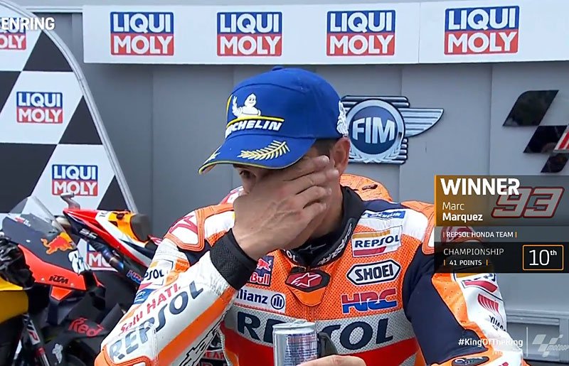 A peine descendu de sa machine après avoir remporté la victoire à l’issue du Grand Prix d’Allemagne au Sachsenring, Marc Márquez s’est confié devant la caméra du site officiel MotoGP.com.
