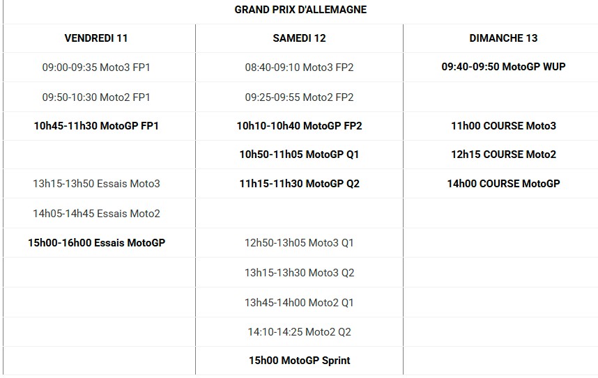 Pendant ce temps, Bezzecchi, en feu avec Aprilia, et Bagnaia savent qu’arrêter Marquez sur son terrain relève de l’exploit. Le paddock retient son souffle : le roi du Sachsenring va-t-il encore régner ? La question est posée mais une chose est sûre, Marc Marquez est prêt à faire trembler l’asphalte. Voici les horaires de cette étape qui nous rapproche un peu plus de la mi-saison MotoGP.