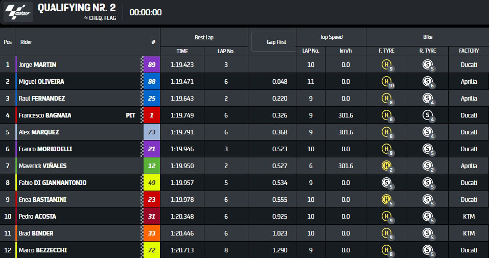 Derrière eux, quatre Ducati se sont succédé : Alex Marquez (Gresini Racing), le double champion Pecco Bagnaia (Team Factory), Enea Bastianini (Team Factory), et Franco Morbidelli (Pramac Racing). Pedro Acosta (KTM Team GASGAS Tech3), Fabio di Giannantonio (Ducati VR46 Racing Team), et Brad Binder (KTM) ont également assuré leur place en Q2.