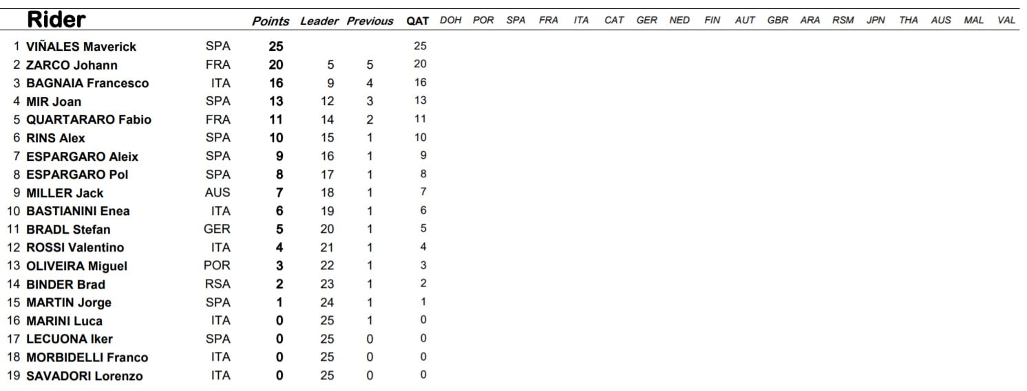 Classement à l’issue du GP du Qatar (manche 1) :