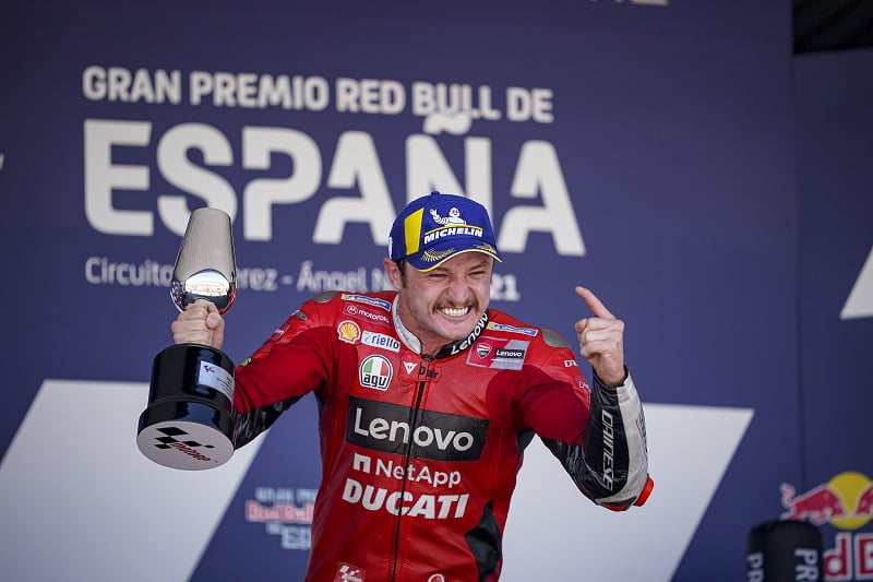 Cinq ans après, Jack Miller remonte enfin sur la première marche du podium ! Le pilote australien, très critiqué depuis le début de la saison alors qu’il souffre de la comparaison avec son coéquipier Pecco Bagnaia – surtout depuis sa chute lors de la dernière manche au Portugal – se rappelle ainsi au bon souvenir de tous en signant la deuxième victoire de sa carrière en MotoGP après celle décrochée à Assen en 2016.