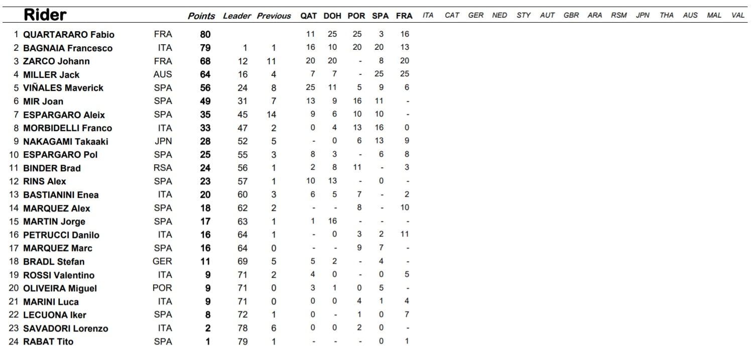 De son côté, Quartararo n’a pu faire mieux que cinquième, ce qui constitue tout de même une rampe de lancement honorable, mais le Niçois va comme de coutume avoir du mal lors des premiers tours de course, allant jusqu’à batailler dur pour préserver sa place dans le top 10. Devant, Martín qui de son propre aveu ne pensait pas pouvoir faire de vieux os en tête continue d’impressionner, conservant le leadership jusque dans les dernières encablures.