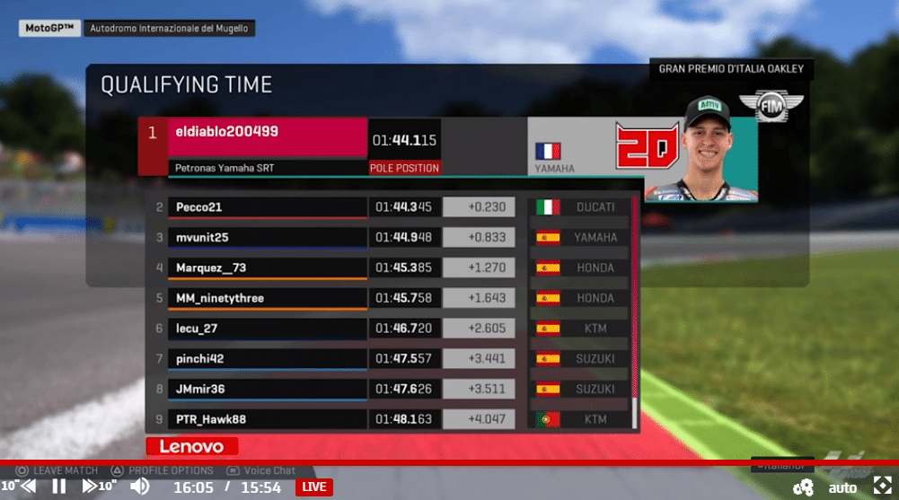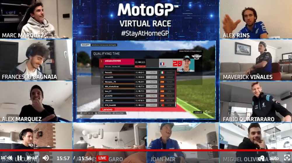 Fabio Quartararo était motivé et même équipé d’un matériel de pro pour rafler la mise dans cette course virtuelle au Mugello. Il a réalisé la pole position mais cela a tourné au vinaigre dès le départ pour le pilote Petronas qui a chuté dans le premier virage. Il a même entraîné Viñales dans son malheur… Il valait mieux que ce soit pour de faux dans le clan Yamaha !