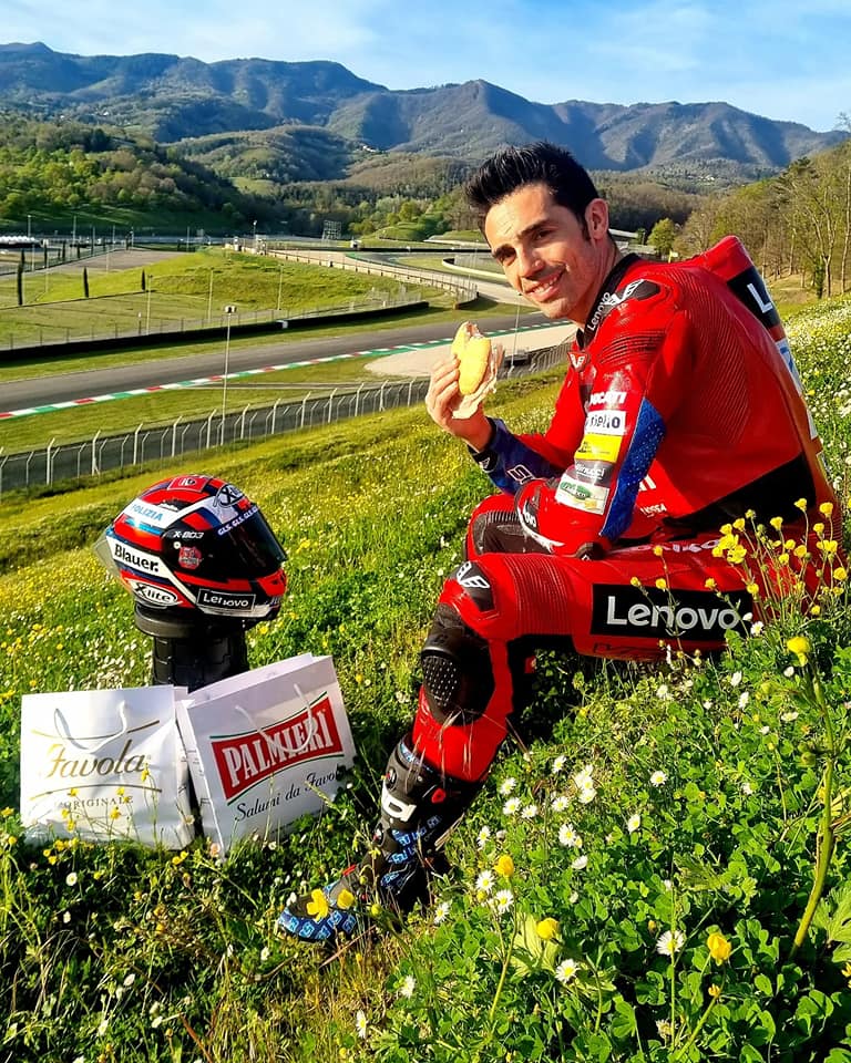 Aussi, pendant que les pilotes titulaires Ducati faisaient leurs bagages pour rejoindre une Europe qui va dérouler la suite du calendrier, le pilote dédié aux tests pour la marque, Michele Pirro, était en plein travail au Mugello. Il a ainsi profité du soleil de ce lundi de Pâques pour pique-niquer avec sa femme, avant d’entrer en action sur la Ducati GP22.