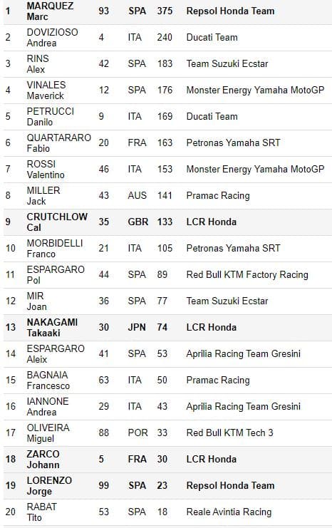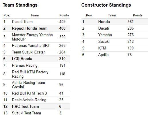 Concernant le Championnat par équipes, le team manager de Repsol Honda, Alberto Puig, est conscient de la difficulté de la situation et préfère botter en touche : « C’est difficile cette année avec ce championnat. Ce serait bien de gagner les trois championnats, la Triple Couronne, pour tout le team Repsol Honda. Marc fait de gros efforts pour y parvenir mais il serait étonnant que nous remportions ce titre cette saison dans les circonstances actuelles. »