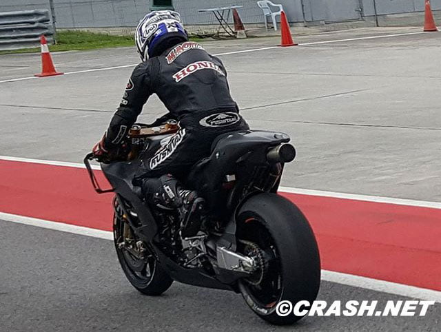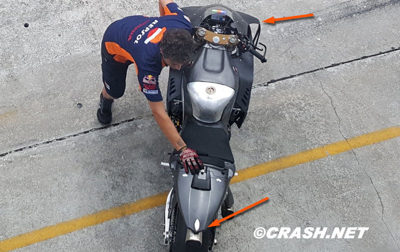 En fait, on ne voit pas grand-chose, si ce n’est qu’une nouvelle attache a fait son apparition sous l’axe de bras oscillant et la photo diffusée par Casey Stoner lui-même, au guidon d’une GP17, peut laisser penser qu’il ne s’agit peut-être que d’une évolution de la GP17. Ou pas (morceau de selle blanc sur la photo ci-dessous)…