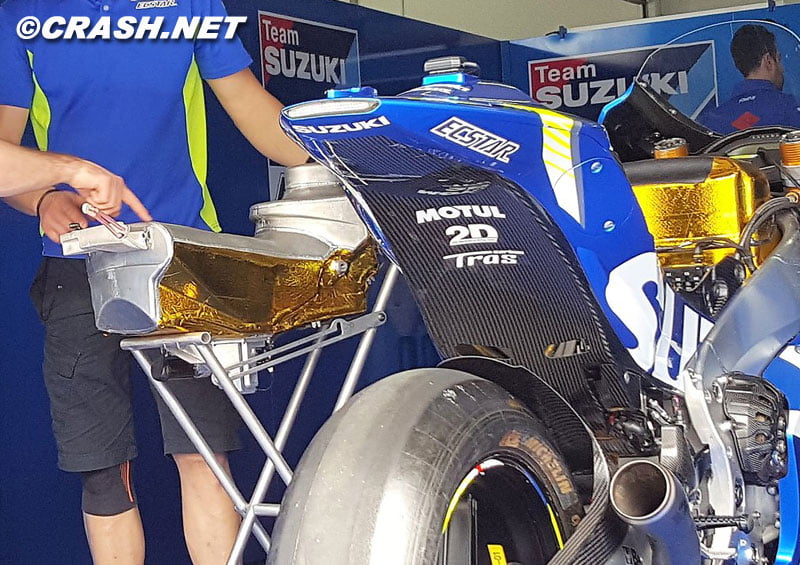 Enfin, cela a également été l’occasion d’observer en détail le tourmenté réservoir de la Suzuki GSX-RR doté de sa protection thermique dorée, déjà entre-aperçu à plusieurs occasions…