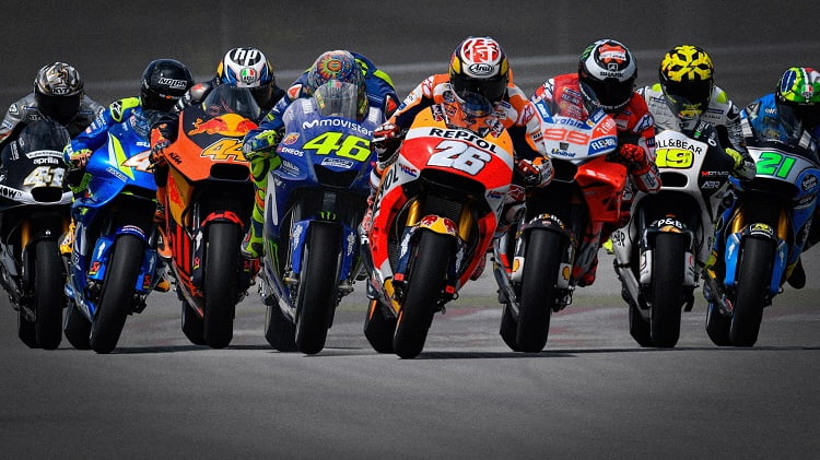 La surprise viendra de l’image en tête d’illustration. Vous y verrez, de gauche à droite, l’Aprilia d’Aleix Espargaro, Alex Rins sur sa Suzuki, Pol Espargaró avec sa KTM, Valentino Rossi au guidon de sa Yamaha, Dani Pedrosa chevauchant sa Honda, Jorge Lorenzo cravachant sa Ducati, Alvaro Bautista à l’œuvre sur sa Ducati satellite et le débutant Morbidelli faisant connaissance avec sa Honda.